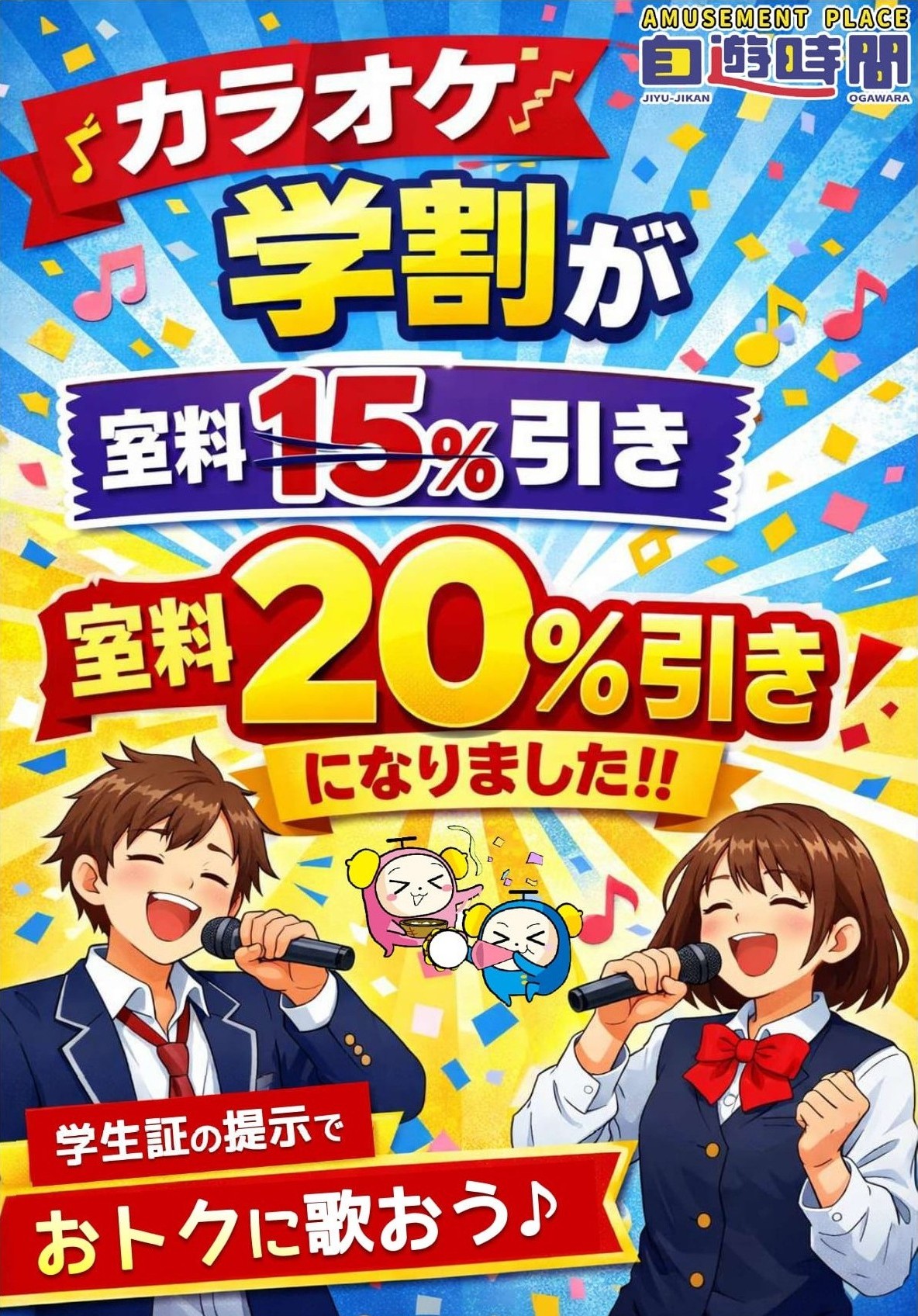 ホーム > お知らせ > 🎤学割がさらにおトクになりました!! 2026年4月10日 🎤学割がさらにおトクになりました!!学生の皆さまに嬉しいお知らせです!!カラオケ学割がこれまでの「室料15%OFF」から「室料20%OFF」へアップ👏✨より気軽に、よりお得にご利用いただけるようになりました。友達とのご利用やグループでのご来店にもぴったりです!ぜひ新しくなった学割をご活用ください♪ Prev前の記事🎯ダーツ場貸し切りできます!